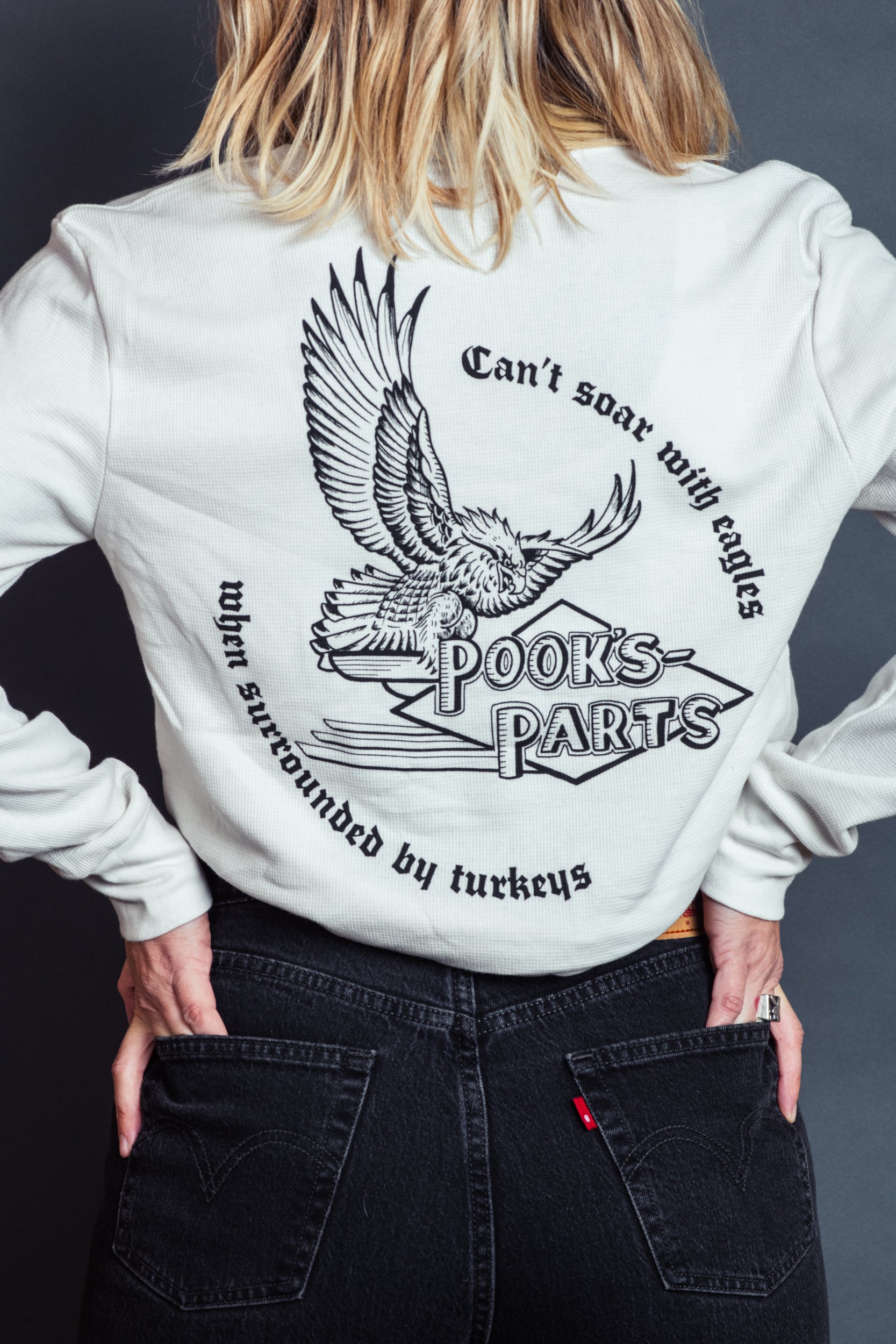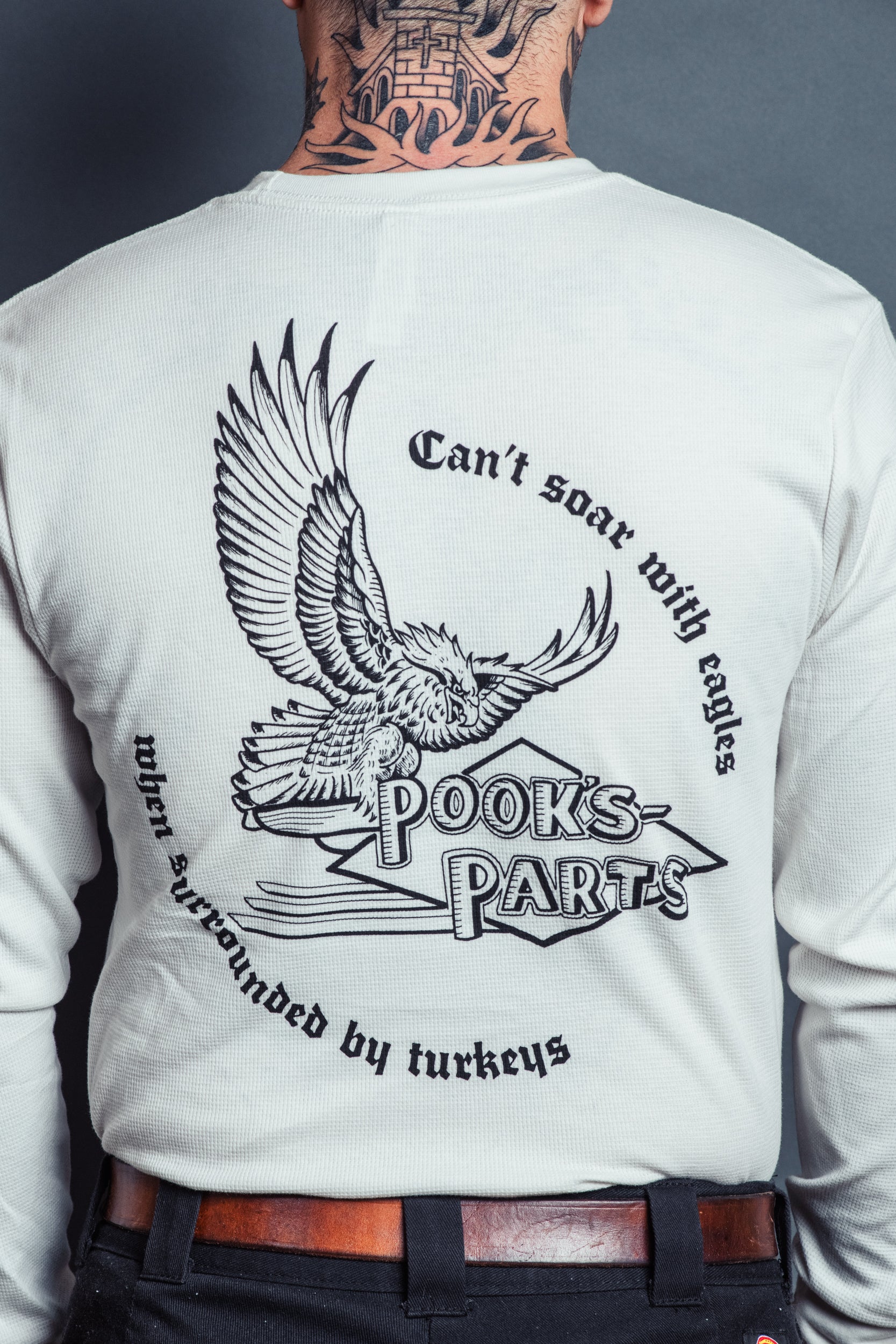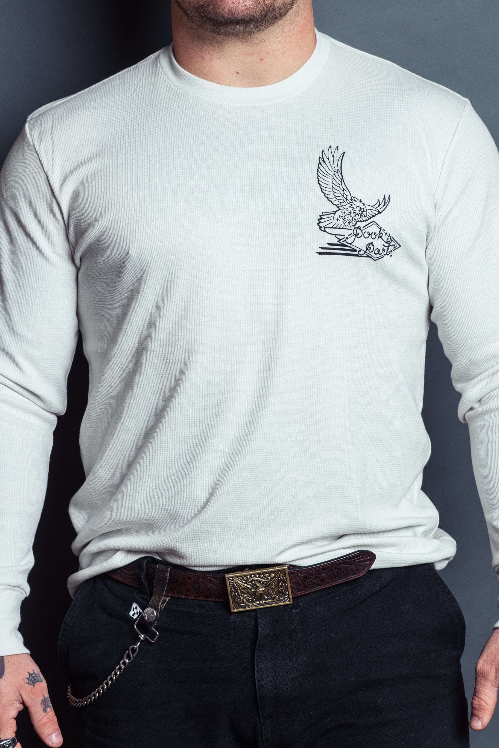 Printed on a "bone" Ideal brand loose fit waffle thermal. A true to size loose fitting thermal. Want a tighter fit? Just order a size under! No bulky inks or awkward fits. Soar with the eagles and leave them turkeys behind. Choose comfort and quality.